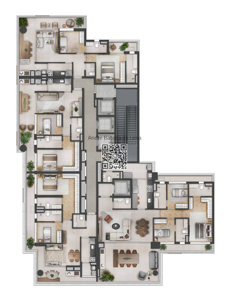 São mais de 4.400m² de terreno, com áreas comuns decoradas por Carlos Rossi e paisagismo de Ricardo Cardim, priorizando a natureza e a convivência entre os moradores.