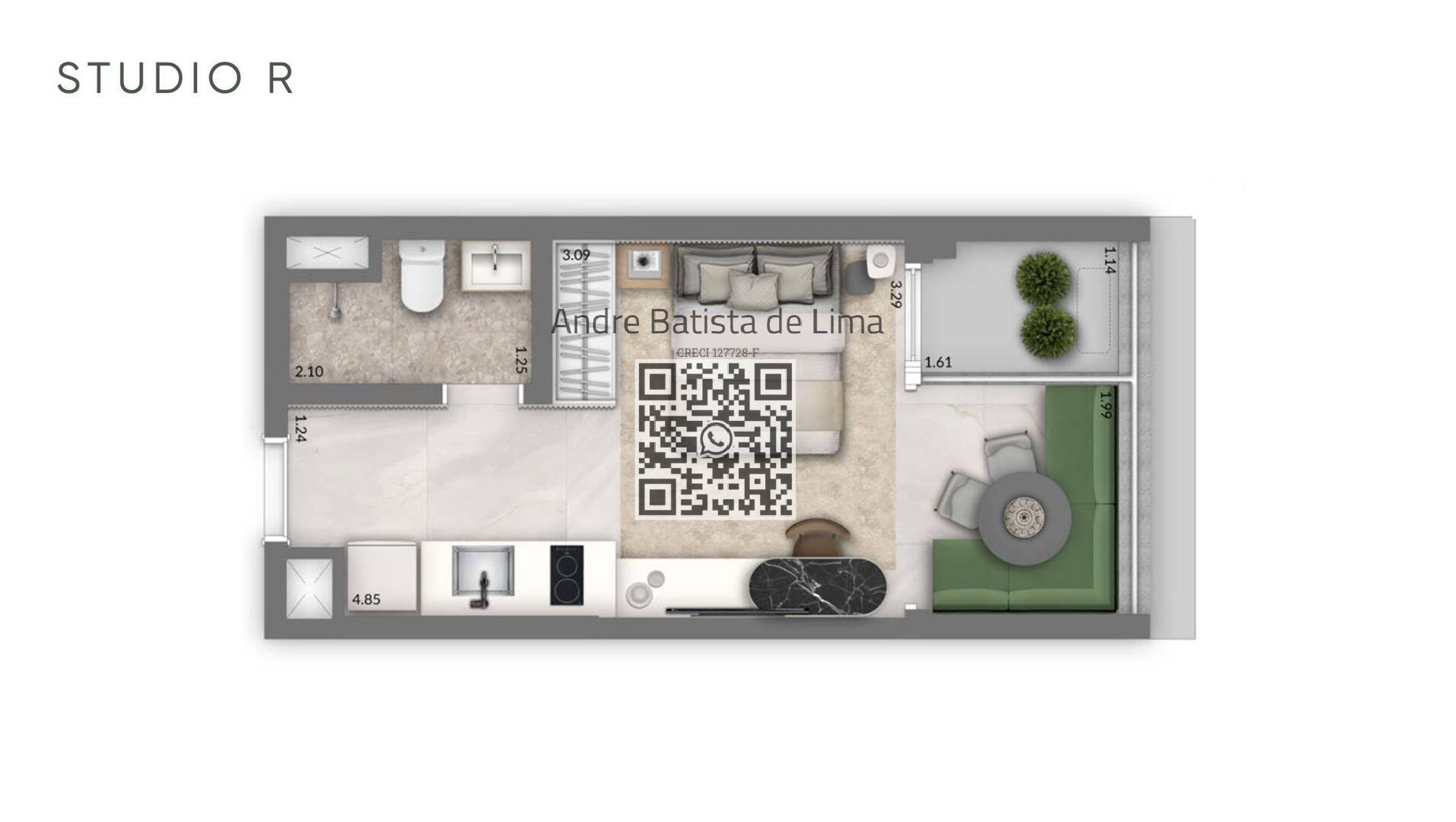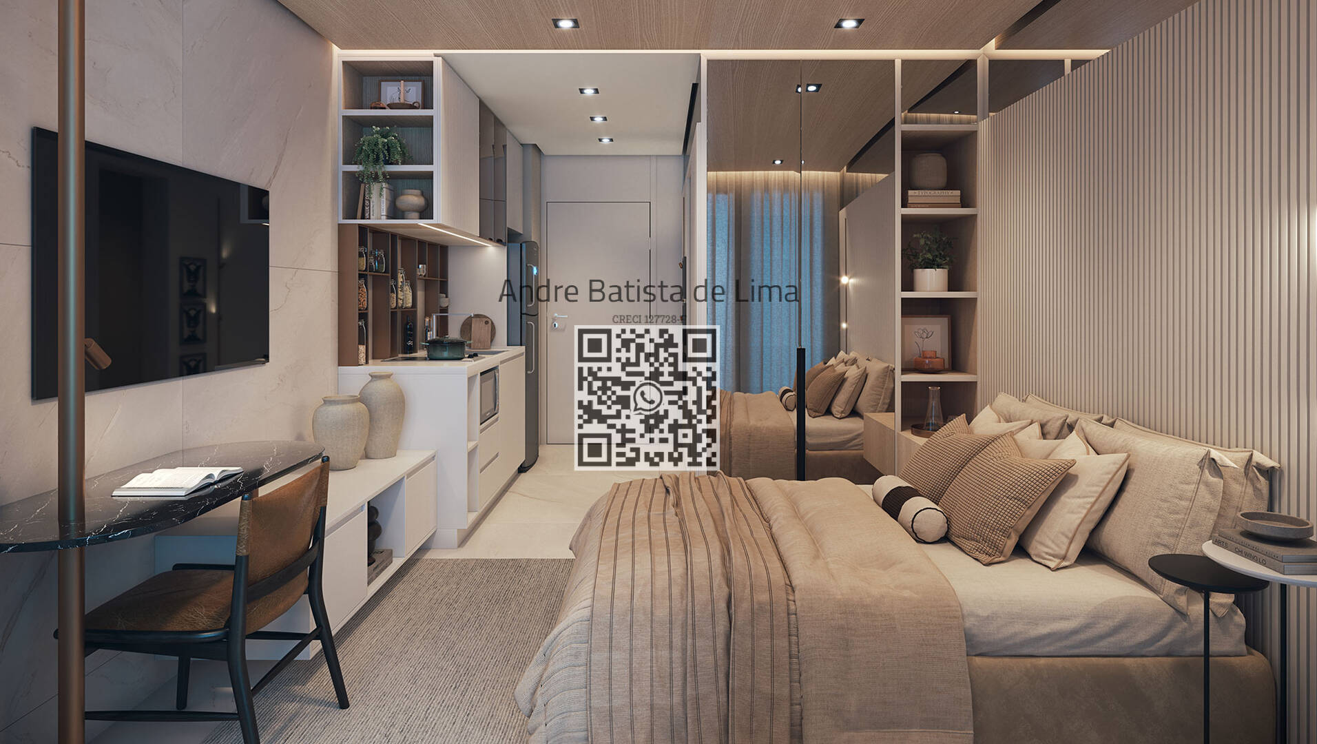 O dormitório é confortável e versátil, ideal para quem busca aconchego sem abrir mão da funcionalidade. Já a cozinha e a sala foram pensadas para atender às necessidades do dia a dia com praticidade e estilo.